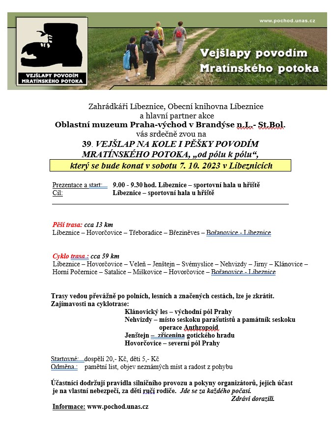 Zahrádkáři Líbeznice, Obecní knihovna Líbeznice a hlavní partner akce Oblastní muzeum Praha-východ vás srdečně zvou na 39. Vejšlap na kole i pěšky povodím Mratínského potoka, který se koná v sobotu 7.10. 2023. Prezentace a start je od 9.00 až 9.30 hodin od haly Na Chrupavce. Pěší trasa je dlouhá 13 km, trasa pro cyklisty je dlouhá 59 km. Startovné činí 20,- Kč pro dospělé a 5,- Kč pro děti.