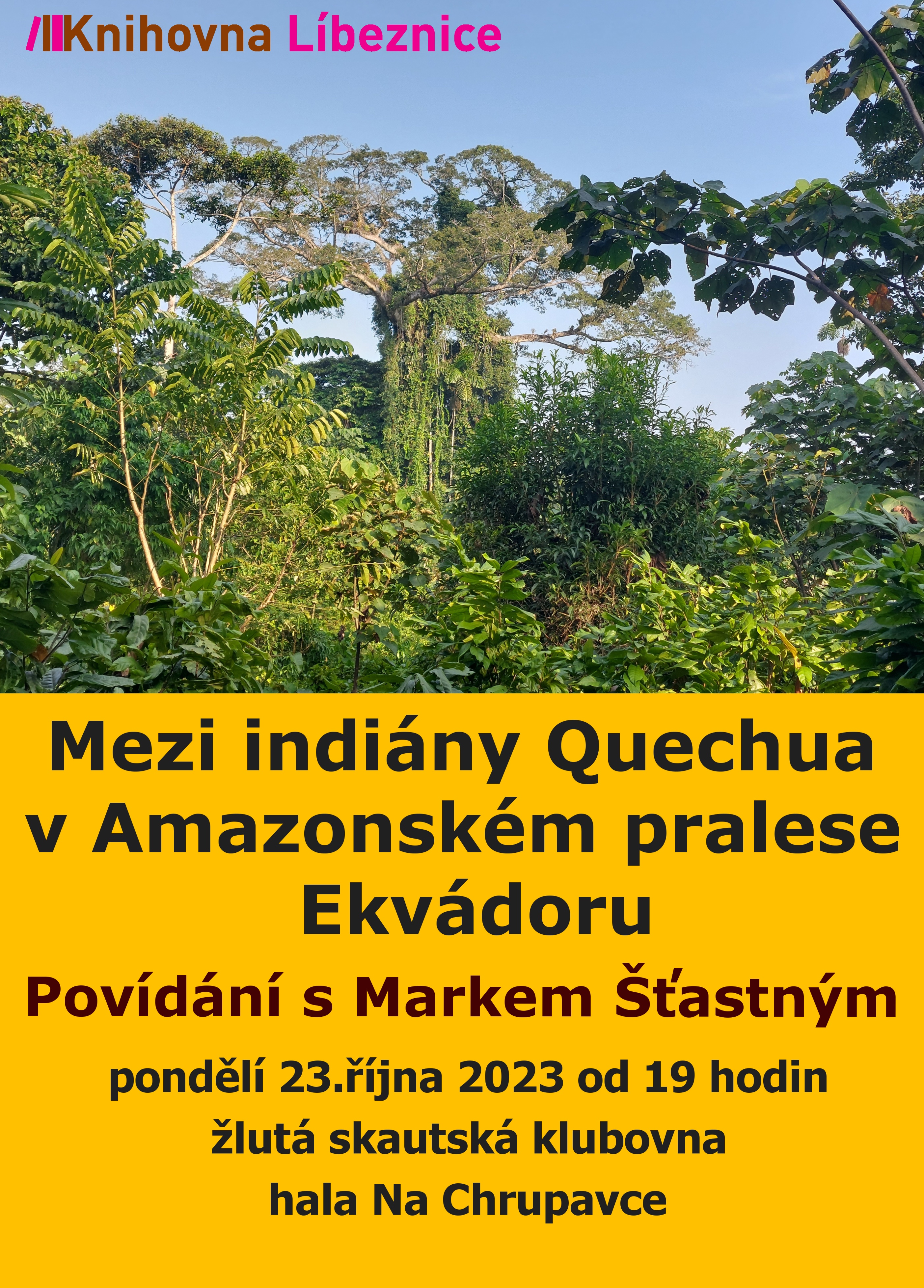 Obecní knihovna Líbeznice vás srdečně zve na cestopisné povídání s Markem Šťastným "Mezi indiány Quechua v Amazonském pralese Ekvádoru", které se uskuteční v pondělí 23.10. 2023 od 19.00 ve skautské klubovně v hale Na Chrupavce. Vstup zdarma.