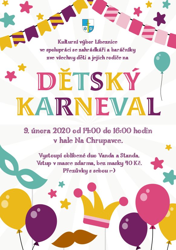 Srdečně zveme všechny děti a jejich rodiče na dětský karneval, který se bude konat v neděli 9. února 2020 od 14:00 v Hale Na Chrupavce. Karnevalem budou provázet oblíbení baviči Vanda a Standa.