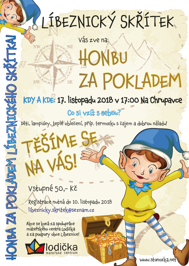 Zveme všechny příznivce skřítků, pohádek a lampiónů na dobrodružnou "Honbu za pokladem líbeznického skřítka". Akce se koná v sobotu 17.listopadu 2018 od 17:00 hodin se startem "Na Chrupavce". Registrace je možná do 10.listopadu 2018 na adrese: libeznicky.skritek@seznam.cz. Těšíme se na Vás!