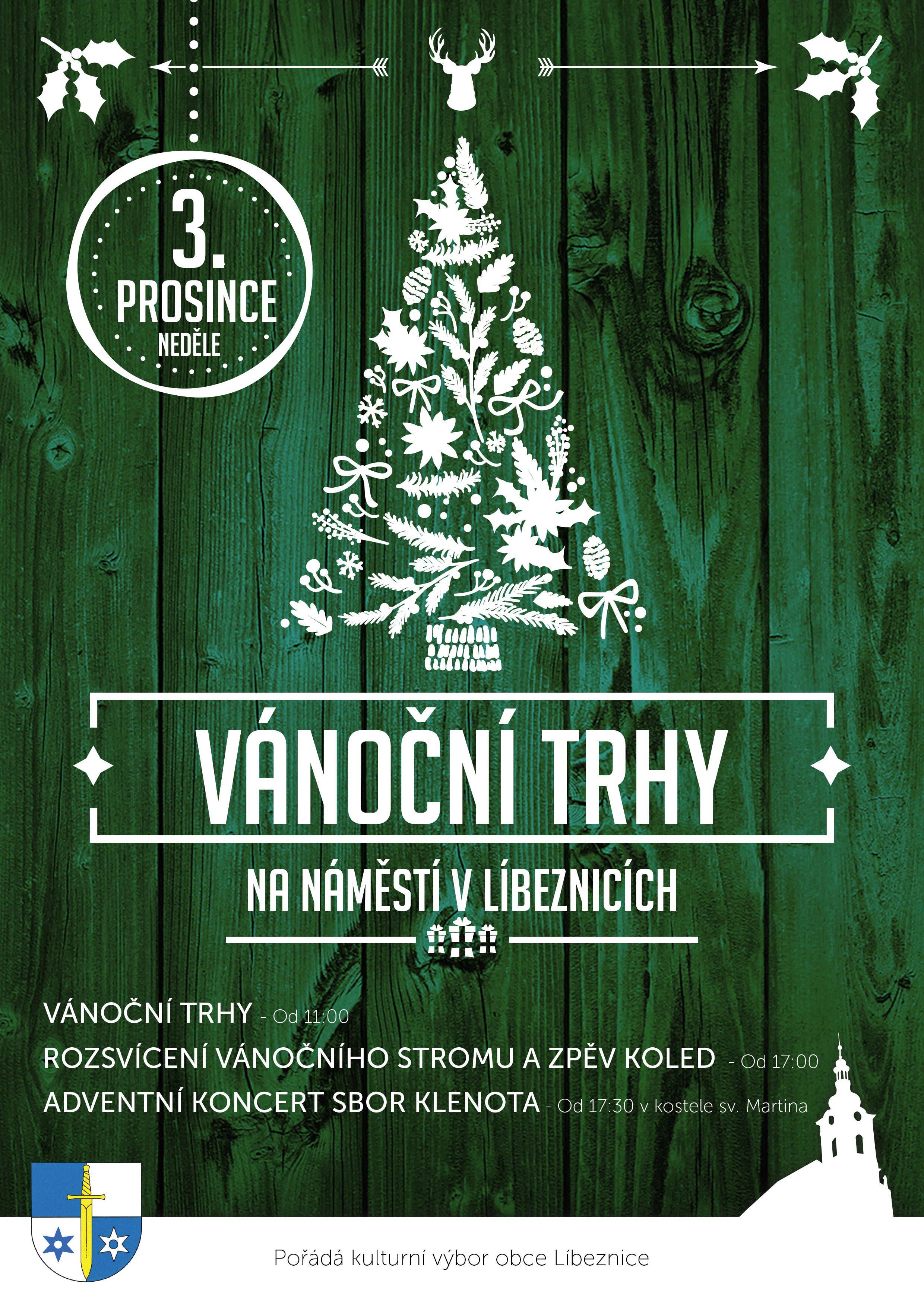 Kulturní výbor obce Líbeznice vás zve v první adventní neděli 3.12. v 11:00 na vánoční trhy, v 17:00 na tradiční společné rozsvícení vánočního stromu za zpěvu koled a na adventní koncert sboru Klenota v kostele sv. Martina, který začne v 17:30.