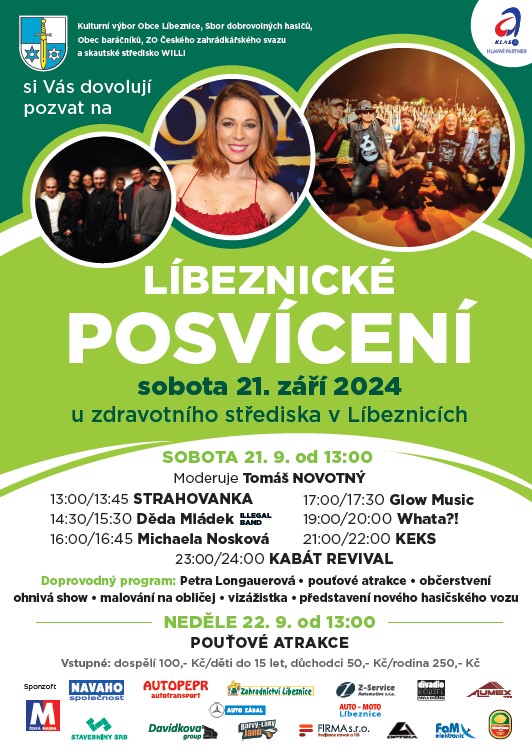 Srdečně vás zveme na tradiční Líbeznické posvícení, které se uskuteční v sobotu 21.9. 2024 od 13.00 v parku u zdravotního střediska. Těšit se můžete na bohatý kulturní a gastronomický program. Vstupné zůstává nezměněno a činí: dospělí 100,- Kč, děti do 15 let a důchodci 50,- Kč, rodina 250,- Kč.