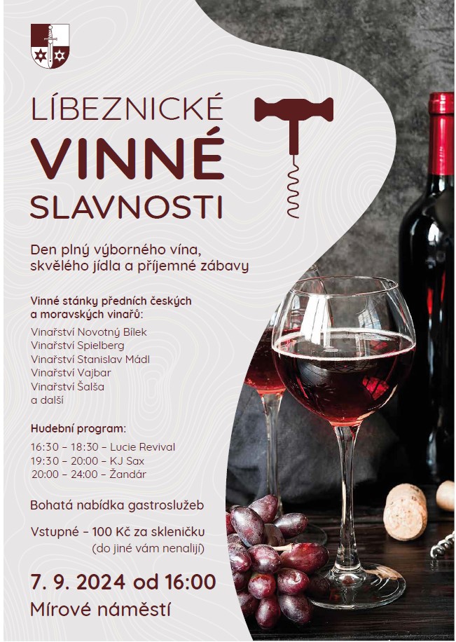 Obec Líbeznice vás srdečně zve na tradiční Líbeznické vinné slavnosti, které se uskuteční v sobotu 7.září 2024 od 16.00 na Mírovém náměstí. Těšit se můžete na vinné stánky předních českých a moravských vinařů, bohatý kulturní a gastronomický program. Vstupné 100,- Kč za skleničku.