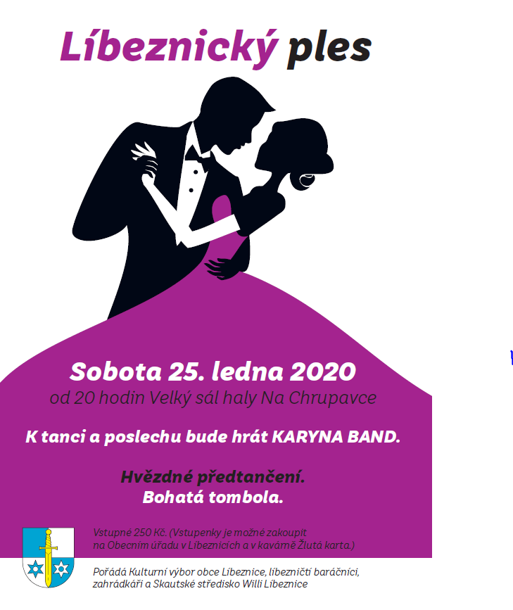 Kulturní výbor obce Líbeznice, líbezničtí baráčníci, zahrádkáři a Skautské středisko Willi srdečně zvou na Líbeznický ples, který se uskuteční v sobotu 25. ledna 2020 od 20:00 ve Velkém sále haly Na Chrupavce. K tanci zahraje KARYNA BAND, na programu je také hvězdné předtančení a bohatá tombola. Vstupenky je možné zakoupit na obecním úřadu v Líbeznicích nebo v kavárně Žlutá karta.