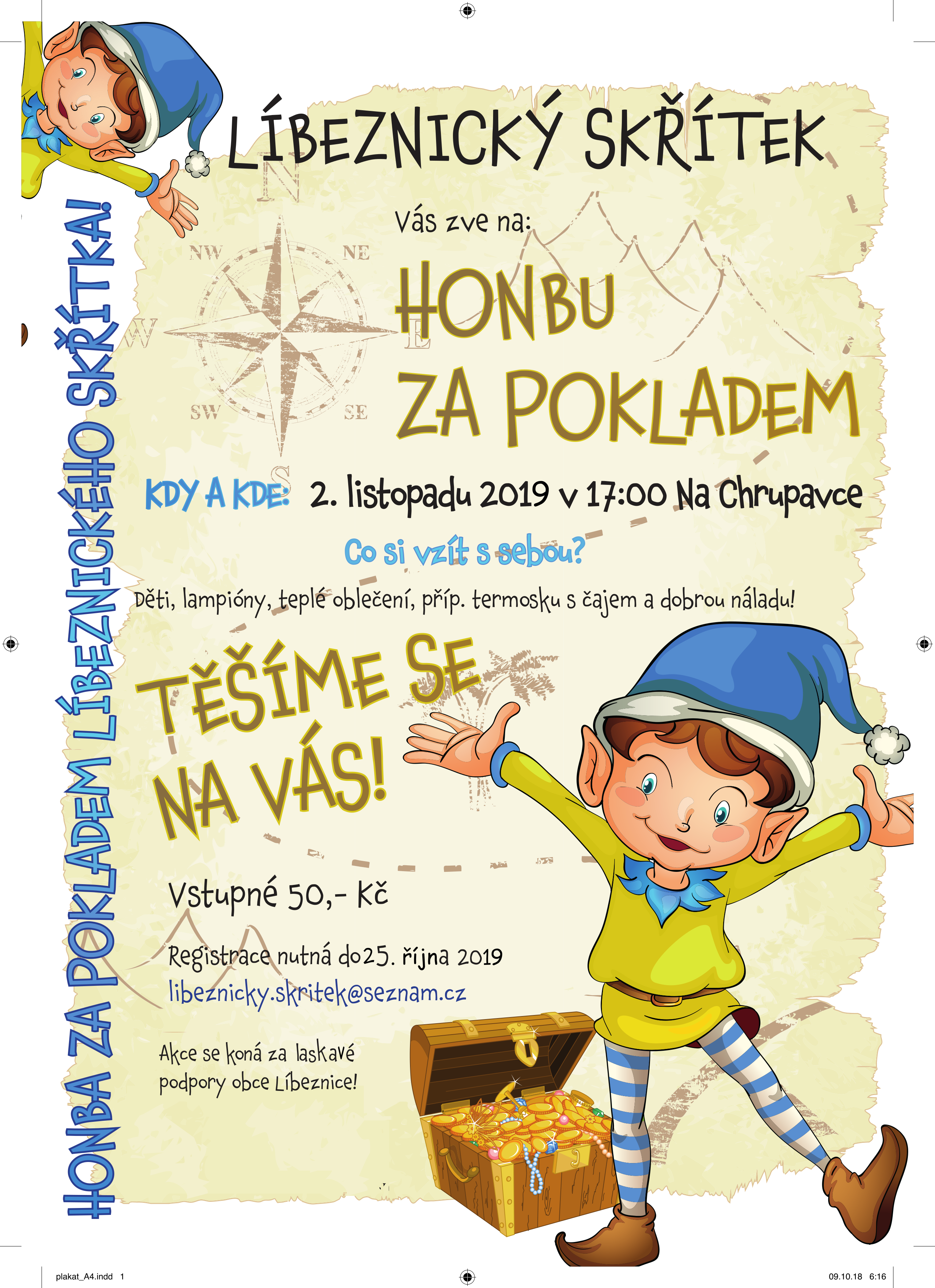 Dne 2.11.2019 v 17:00 hodin zveme všechny příznivce akce "Honba za pokladem líbeznického skřítka" na další pohádkovou cestu s překvapením. Startujeme Na Chrupavce (v Café & Baru Žlutá karta) a míříme na areál zdraví (k MéLíbeKafe). Registrace nutná do 25. října 2019 na libeznicky.skritek@seznam.cz . Těšíme se na Vás!