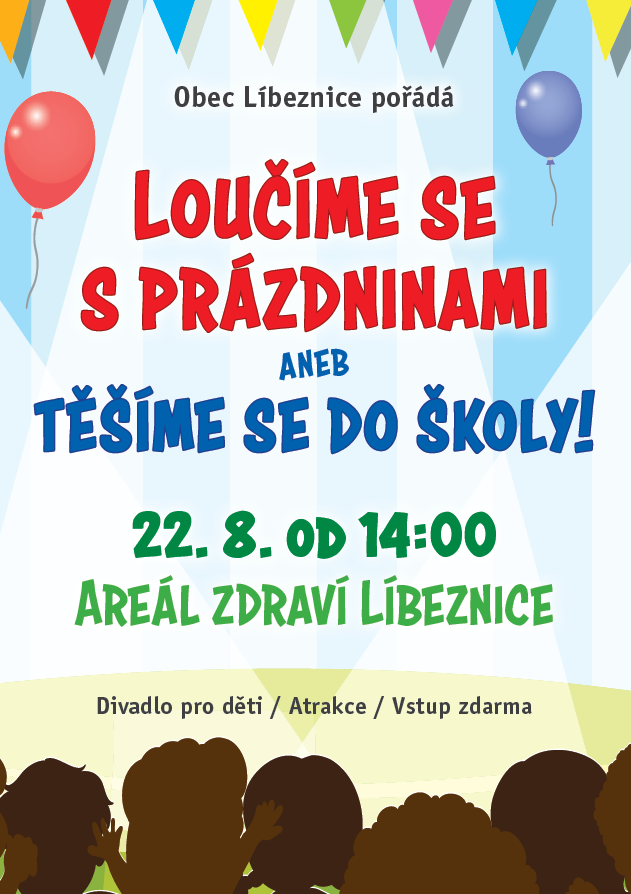 Obec Líbeznice zve všechny školáky, děti i dospělé na akci Loučíme se s prázdninami aneb Těšíme se do školy!, která se uskuteční v sobotu 22. srpna od 14:00 v Areálu zdraví. Těšit se můžete na divadlo pro děti a dětské atrakce. Vstup zdarma.