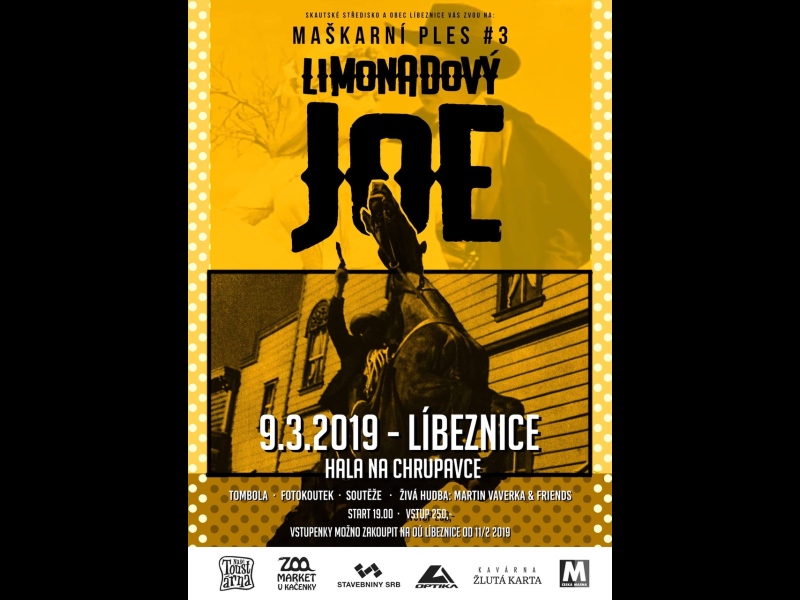 Líbezničtí skauti a Obec Líbeznice Vás zvou na Maškarní ples pro dospělé v sobotu 9. března 2019 od 19 hodin do haly Na Chrupavce. Přeneste se na divoký západ, kde vzduchem sviští kulky a v barech stále houstne dým, kde se svět ostře dělí na hrdiny a padouchy. Letošní Maškarní ples má jako téma slavný český film Limonádový Joe. Pokud se ale na půdě správný kostým nenajdete, nezoufejte. Maska není podmínkou účasti. K tanci vás nepochybně strhne skvělá kapela Martin Vaverka & Friends. Čeká na vás také bohatá tombola, fotokoutek a originálně pojatý program. Vstupné 250 Kč. Vstupenky je možné zakoupit na Obecním úřadě v Líbeznicích.
