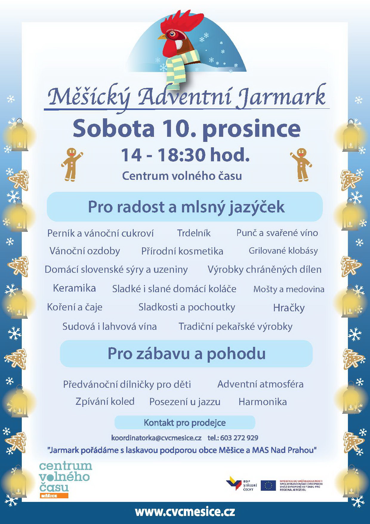 V sobotu 10. prosince 2016 proběhne od 14 do 18:30 hodin v Centru volného času v Měšicích Měšický adventní jarmark. Více informací naleznete v příloze.