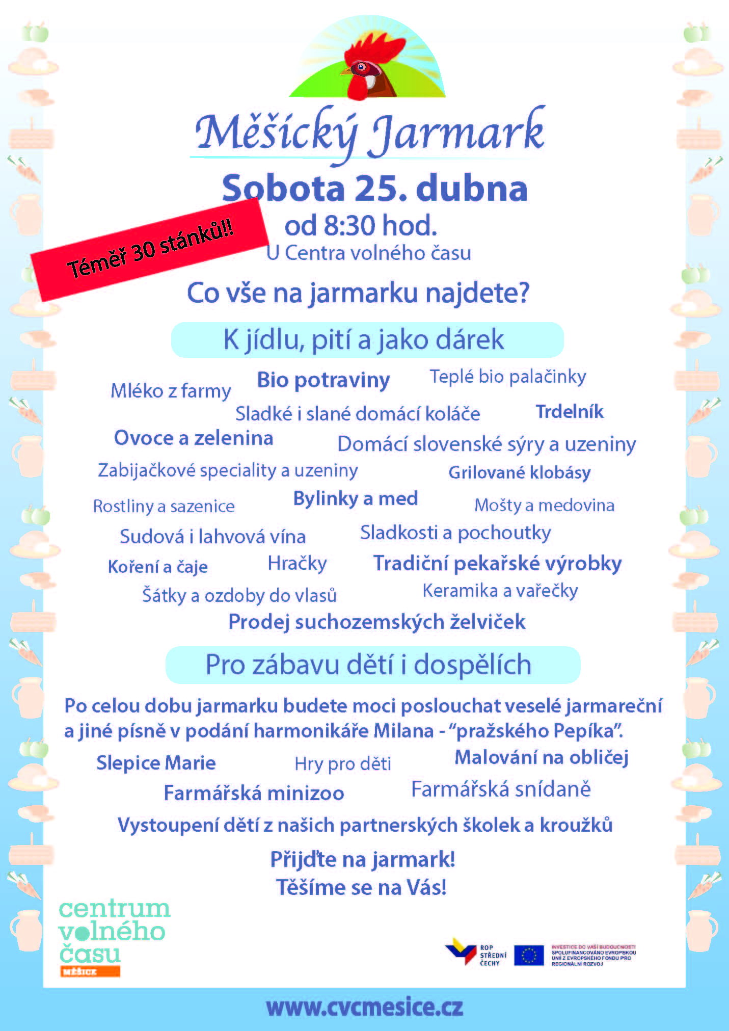 Centrum volného času Měšice s podporou obce Měšice a MAS Nad Prahou Vás zve na Měšický jarmark, který se koná v sobotu 25. dubna od 8:30 u Centra volného času v Měšicích. Přijďte nakoupit farmářské produkty i rukodělné výrobky. Připraven je také doprovodný program pro děti i dospělé.
