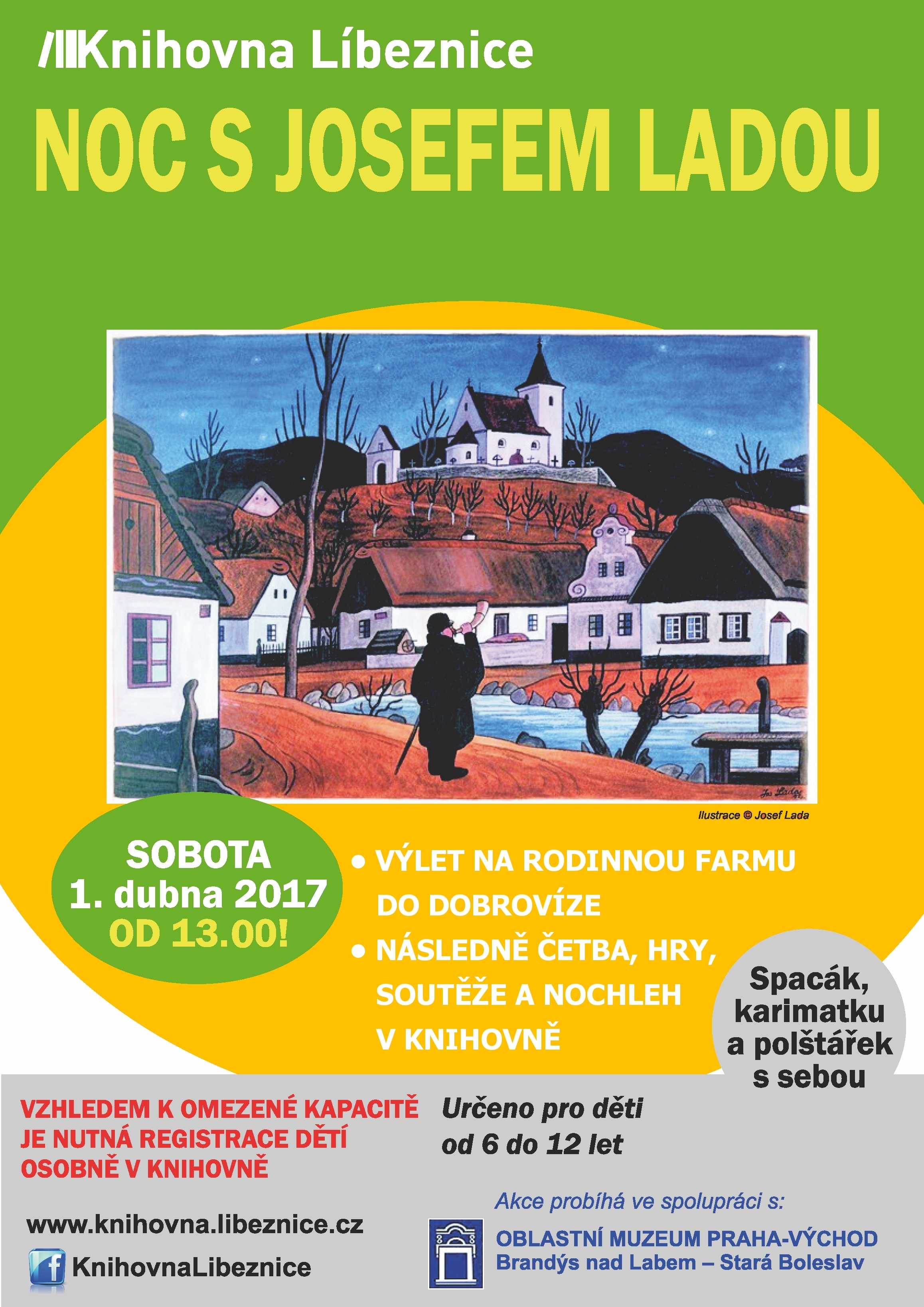 Knihovna Líbeznice zve v sobotu 1. dubna od 13 hodin děti na Noc s Josefem Ladou. Výlet, četba, hry, soutěže a nocleh v knihovně. Určeno dětem od 6 do 12 let. Nutná registrace dětí předem v knihovně.