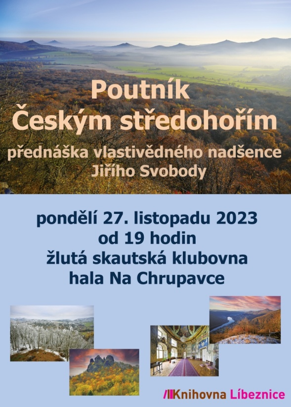 Obecní knihovna Líbeznice vás srdečně zve na přednášku vlastivědného nadšence Jiřího Svobody "Poutník Českým středohořím". Přednáška se koná v pondělí 27.11. 2023 od 19.00 ve skautské klubovně v hale Na Chrupavce.