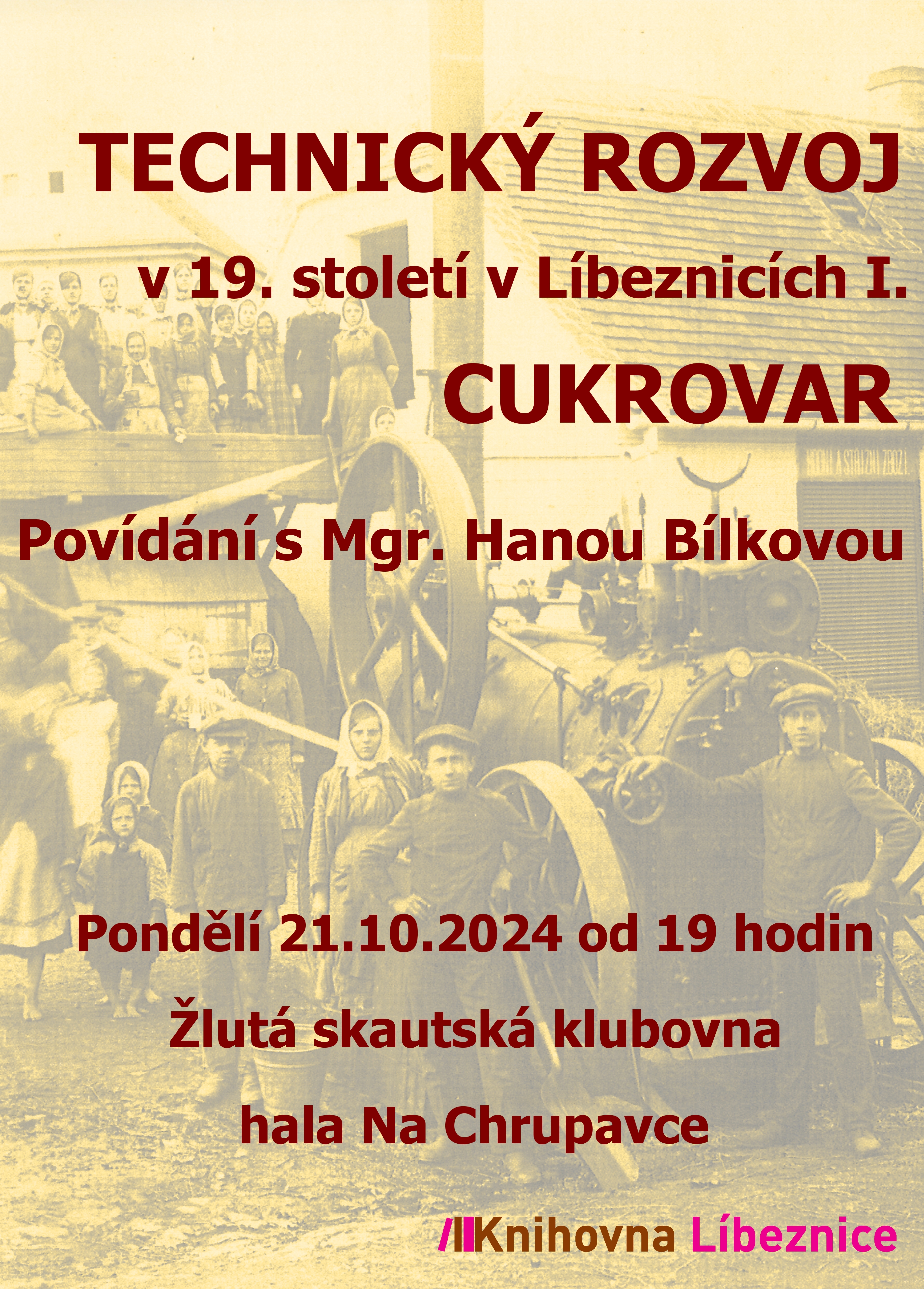 Obecní knihovna Líbeznice vás srdečně zve na další povídání s Mgr. Hanou Bílkovou, jejíž znalost historie naší obce je zcela jedinečná. Tentokrát bude tématem povídání technický rozvoj v Líbeznicích v 19. století - cukrovar. Povídání se uskuteční dne 21.10. 2024 od 19.00 hodin ve skautské klubovně v hale Na Chrupavce. Vstup zdarma.