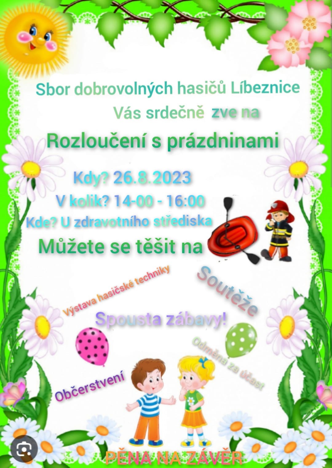 Sbor dobrovolných hasičů Líbeznice vás srdečně zve na Rozloučení s prázdninami, které se koná v sobotu 26.8. 2023 od 14.00 v parku u zdravotního střediska. Těšit se můžete na hasičskou techniku, soutěže, občerstvení, odměny za účast a pěnu na závěr. Pro děti zmrzlina a limonáda zdarma.