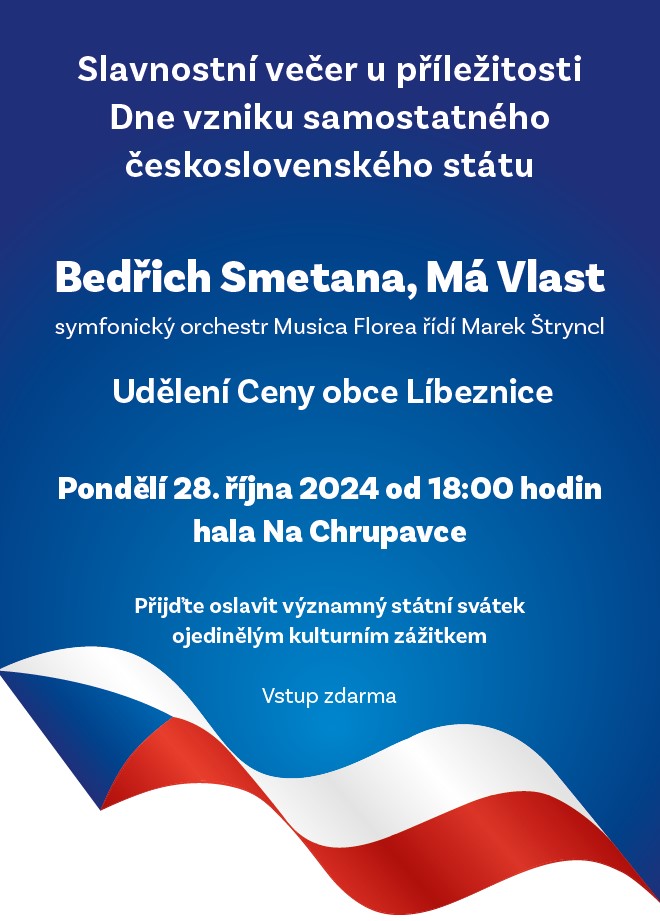 Srdečně vás zveme na slavností večer u příležitosti vzniku samostatné Československé republiky, který se uskuteční dne 28.10. 2024 od 18.00 hodin ve velkém sále v hale Na Chrupavce. V rámci slavnostního večera zazní cyklus symfonických básní Má vlast od Bedřicha Smetany v podání symfonického orchestru Musica Florea a bude udělena Cena obce Líbeznice. Vstup zdarma.