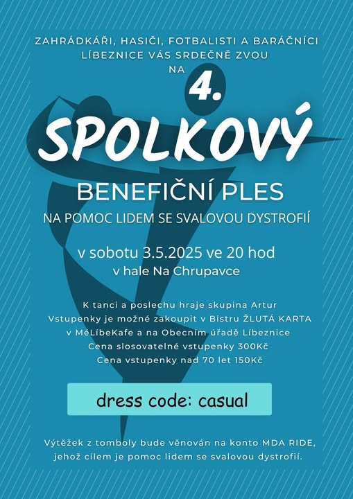 Líbeznické spolky vás srdečně zvou na 4. Spolkový benefiční ples na pomoc lidem se svalovou dystrofií, který se koná v sobotu 3.5. 2025 od 20.00 hodin v hale Na Chrupavce. K tanci a poslechu zahraje skupina Artur. Těšit se můžete na bohatou tombolu. Vstupné činí 300,- Kč, pro osoby starší 70 let činí 150,- Kč.