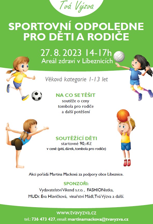 Srdečně zveme děti a jejich rodiče na Sportovní odpoledne do Areálu zdraví, které se koná v neděli 27.8. od 14.00 do 17.00 hodin. Akci pořádá paní Martina Macková. Těšit se můžete na soutěže o ceny a tombolu pro rodiče. Akce je určena pro děti ve věku 1 rok až 13 let. Startovné činí 90,- Kč.