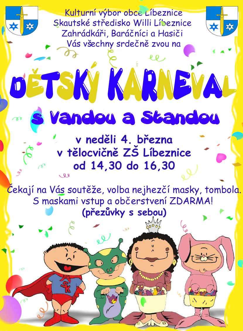 V neděli 4. 3. 2012 (posunuto ze soboty 3. 3. 2012) vás všechny srdečně zveme od 14:30 hod do tělocvičny ZŠ Líbeznice na Dětský karneval s Vandou a Standou.Přijďte si užít hezké odpoledne s Vandou a Standou, kteří si pro vás opět připraví spoustu her, písniček a soutěž o nejhezčí masku. Dále se můžete těšit na bohatou tombolu a drobné občerstvení, které přijde jistě k duhu. A my se zase budeme těšit na vás! Ahoj v neděli. Kulturní výbor obce Líbeznice