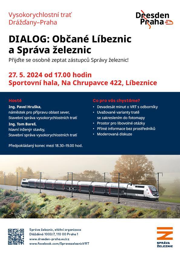 Chtěli bychom vás pozvat na veřejné setkání formou dialogu se zástupci Správy železnic, která je investorem vysokorychlostní trati Praha - Drážďany. Na tomto setkání bude představena aktuální podoba trati na území Líbeznic a průběh a harmonogram přípravy. Zodpovězeny budou libovolné dotazy, které položíte. Nenechte si tutu příležitost ujít. Setkání se koná dne 27.5. 2024 od 17.00 v hale Na Chrupavce.
