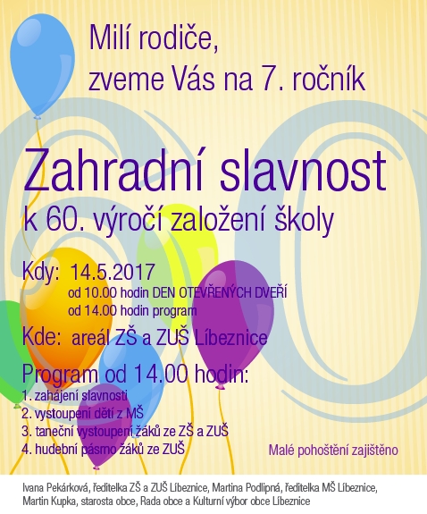 Tradiční oslava Dne matek v areálu líbeznických škol bude letos zároveň velkou připomínkou 60. výročí školy. V neděli 14. května už od 10 hodin bude ve všech budovách školy Den otevřených dveří. Ve 14 hodin pak v přírodním amfiteátru začne vystoupením nejmenších dětí odpolední kulturní program. Vystoupí postupně děti z MŠ, žáci ZŠ a celé odpoledne vyvrcholí vystoupením žáků ZUŠ. Vstup zdarma. Drobné občerstvení zajištěno.