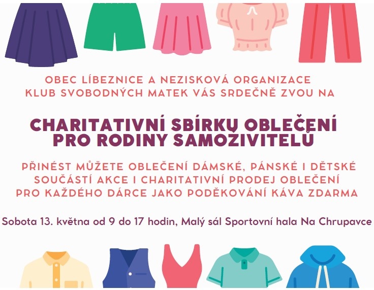 Již tuto sobotu 13.5. 2023 se v hale Na Chrupavce (malý sál) koná od 9.00 do 17.00 hodin charitativní sbírka oblečení pro rodiny samoživitelů. Sbírku pořádá obec Líbeznice a nezisková organizace Klub svobodných matek. Přinést můžete oblečení dámské, pánské i dětské. Součástí akce je i charitativní prodej oblečení. Pro každého dárce jako poděkování káva zdarma.