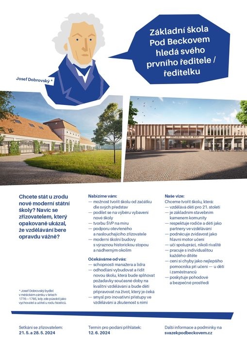 Pro svazkovou základní školu Pod Beckovem hledáme prvního ředitele nebo ředitelku. Hledáme pedagogického lídra a manažera, který má vizi, odhodlání a energii nastartovat novou inovativní školu stojící na respektujícím přístupu k žákům i rodičům. Vytvoření koncepce školy je ale jen jedním z úkolů, který vás čeká. Na začátku budete spolu s námi spolupracovat na dokončení stavby školy včetně jejího vybavení. Pak vás čeká úkol nejtěžší a tím bude postavit tým kvalitních pedagogů a dalších zaměstnanců, správně je motivovat a vytvořit systém podpory jejich profesního rozvoje. Nabízíme vám u toho maximální podporu zřizovatele, který má vzdělávání jako jednu z hlavních priorit a ví, že současné RVP není pro vytvoření skvělé státní školy překážkou. V neposlední řadě nabízíme inspirativní zázemí ve formě dvou středně velkých školských budov v unikátním historickém a zeleném prostředí. Zdá se vám to jako vysněná práce? Těšíme se na vaši přihlášku a účast v konkurzu.