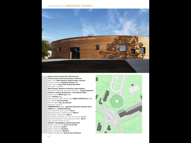 Poezii tohoto kontrastu skutečné horizontály a pomyslných vertikál umocňuje pěkná živá grafika písmen a stylizovaných planet od Zuzany Brychtové Horecké a Ondřeje Štorma. Z hlediska zrodu nové architektury se tedy dnes Líbeznice jeví jako plodné místo. Chystá se v nich další novostavba. Obec totiž postrádá krytou halu pro sportování, velké kulturní akce a občanská shromáždění a tento deficit napraví nová budova, pro kterou už bylo vyhlédnuto staveniště v parku poblíž polikliniky. V ateliéru M1 ji v roce 2014 navrhl jakýsi hlavní architekt Líbeznic Jan Hájek, spolu s Jakubem Havlasem a Zuzanou Hanuškovou. Do svého samonosného dřevěného pláště, tentokrát ne úplně kulatého, jak to už známe z „rondelu“ základní školy, nýbrž aspoň na obou koncích zakulaceného, pojme nová stavba nejen velký sál, ale i posilovnu, skautskou klubovnu, dětské centrum a kavárnu, jaká zatím v Líbeznicích chybí. Představuji si, jak v sále nebo v kavárně starosta Kupka debatuje s občany a jak mu přitom téměř všichni věří, že dobrá architektura umí zlepšit život.