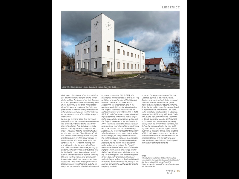 Opakuji znovu, že obecní úřad i dům služeb se staly skutečnou architekturou díky dotaci na zateplení. Tento fakt si zaslouží být zapsán do dějin, protože víme, že obvykle má zateplování na architekturu dopad opačný, negativní, „dezarchitektonizující“. V Líbeznicích lze nicméně najít ještě dvě další budovy, které zateplení, provedené pod kontrolou M1, dokázalo architektonicky povznést. U velké školy z padesátých let 20. století k tomu ještě přispěla barevná dekorativní malba Barbory Zachovalové, u polikliniky pak nenápadné detaily, jako je nová textura podnože, volba správných okenních rámů a jemné zelené pásky svinutých rolet nad okny. Většího stavebního zásahu se ve srovnání s těmito nenákladnými úpravami dočkala jen budova mateřské školy naproti školnímu okrsku (2013–2014), rozšířená tak, aby se i na přístavbu přenesl původní nepříliš ambiciózní styl prvorepublikové vilky, a přece opatřená pěkným „skyboxem“ na jedné a neméně pěkným dřevěným únikovým schodištěm na druhé straně.