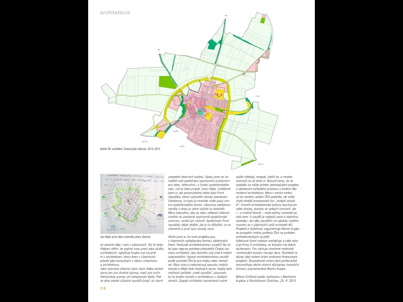 Rámec líbeznických iniciativ tvoří nový územní plán, schválený zastupitelstvem na začátku roku 2015, dílo architektů Jana Hájka, Pavla Joby, Jakuba Havlase a Zuzany Hanuškové z ateliéru M1. Za svou hlavní zásadu si tento plán klade stanovení hranice, za jakou by se už obec neměla rozšiřovat do volné krajiny, a navrhuje proto Líbeznice obkroužit procházkovými alejemi. Znalci současné architektury vědí, že podobnou ohraničující funkci aleje kdysi dostaly v regulačním plánu ticinského městečka Monte Carasso, kde je však architekt Luigi Snozzi provedl vnitřkem obce, aby tak oddělil její historické jádro od novějšího a volněji zastavitelného území.7 Použití alejí jako vnějšího prstence, jak tomu bude v Líbeznicích, proto spíše připomene debatu, jakou u nás už delší dobu vedou Roman Koucký, Pavel Hnilička i jiní architekti-urbanisté o nutnosti utlumit proměnu okrajů měst na zmatenou sídelní kaši, zastavit jejich rozprostírání a zahušťovat místo toho jejich vnitřek.8 Ze zeleného kruhu kolem Líbeznic budou na všechny strany vybíhat pěší cesty a cyklostezky, které zamíří k okolním vesnicím, významným památkám nebo přírodním dominantám. Cestu ke kopci Na Beckově, ale i jiné cesty krajinou opět ozdobí aleje.