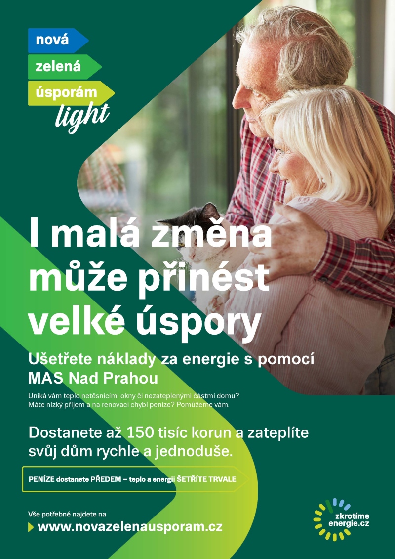 MAS Nad Prahou se připojila k pomoci seniorům a potřebným s administrací dotačního projektu Nová zelená úsporám Light. Jedná se o dotace na zateplení fasády, střechy, podlahy, stropu, či výměnu oken a vchodových dveří až do výše 150 000 kč. Podpora se týká osob bydlících v rodinných domech a trvale obývaných rekreačních objektech. Musí se jednat o domácnosti seniorů pobírajících starobní důchod, invalidní důchodce 3. stupně či osoby pobírající příspěvek na bydlení. Tato pomoc je ze strany MAS poskytována zcela zdarma, kontaktní osobou je Ing. Petr Cuc, tel. 702 204 148, případně emailová adresa info@nadprahou.eu. Podrobnosti o dotaci naleznete v přiloženém souboru.