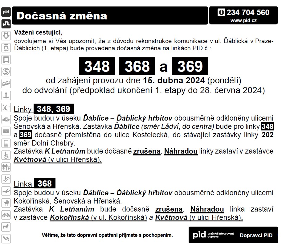 V  souvislosti s rekonstrukcí a uzavírkou ulice Ďáblická 1. Etapa v Praze-Ďáblicích, která bude zahájena od pondělí 15. dubna 2024, dojde k objízdným ztrasám linek 348, 368 a 369. Trvání 1. etapy je plánováno do 28.června, tedy do konce školního roku. Během prázdnin budou následovat další etapy – výluka na těchto linkách tak bude probíhat i během letních prázdnin.