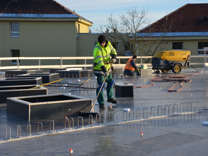 Na ploše střechy geodeti vyměřují všechny prostupy pro technolgie a elektroinstalace. V dalších dnech už budou stavební dělníci na střeše vyvazovat ocelovou výztuž. Vybetonování stropu se plánuje na začátku měsíce března.