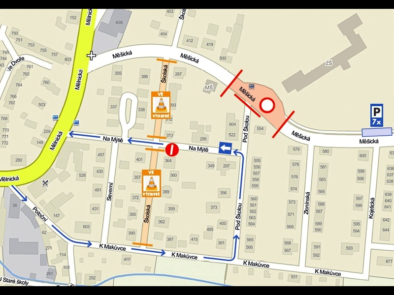 Pro dojíždějící z ostatních směrů doporučujeme zvolit jednosměrný okruh – odbočte z Mělnické ulice u České masy dolů do Potoční ulice, potom dojeďte ulicí K Makůvce do ulice Pod Školou. V této ulici doporučujeme děti vyložit. Nebude tam ale dost prostoru pro parkování, jen pro krátké zastavení. Zpět na Mělnickou se dostanete ulicí Na Mýtě, která bude v tomto období jednosměrná právě ve směru k Mělnické ulici. Je to bohužel komplikované náhradní řešení. Nic lepšího s ohledem na postupující stavbu neexistuje. Prosíme proto o maximální možnou ohleduplnost a trpělivost.