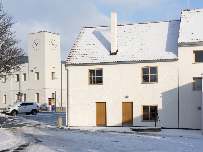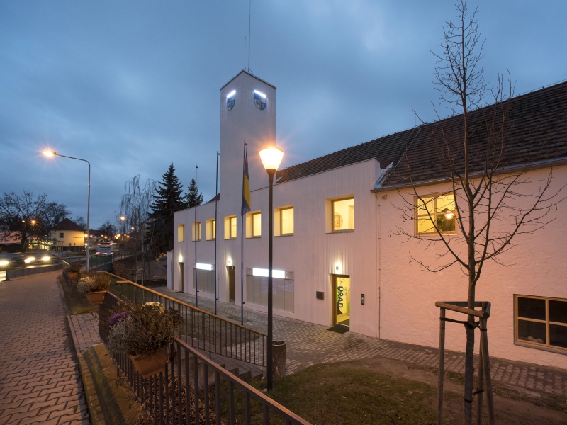 Zateplení polikliniky je uděláno racionálně: nový sokl, rastr oken, ale také jednobarevné stínící markýzy na jižní straně dodávají novou důstojnost. U zbylých dvou staveb je proměna výraznější. Radnice – kvůli mostu utopená před zraky projíždějících – získala po úpravě novou dominantu. A skrze toto mírné zvýšení prostoru kdysi sloužícího k sušení hasičských hadic je nyní viditelná už zdálky; na nově vzniklé věži je umístěn i městský znak. Architekti záměrně zvýšili také rozdílnost mezi dvěma domy, jejichž srostlicí je radnice tvořena. Jeden má fasádu drsnější, druhý jemnější. Liší se od sebe i okny, hlavní budovu pak zvýrazňuje atika.