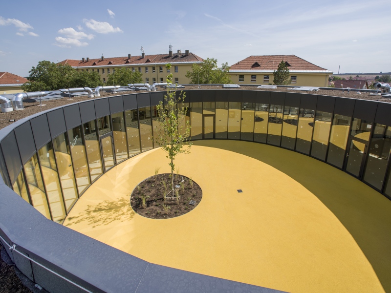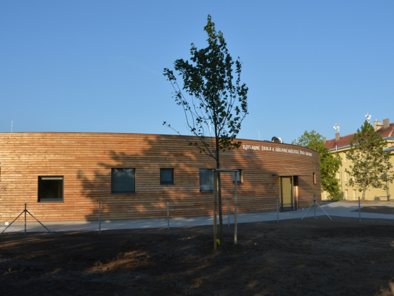 V centru kruhového půdorysu budovy je atrium, které bude sloužit jako učebna či herna pod širým nebem, kterou za pár let zastíní platan. Okolo atria obíhá prostorná chodba s šatnami, z níž se vstupuje do jednotlivých tříd, sborovny a jídelny. Jídelna je zároveň víceúčelovým sálem pro koncerty základní umělecká školy, jež je součástí zdejší základní školy. Intenzita využití pavilonu bude veliká i vzhledem k tomu, že všechny třídy budou sloužit v odpoledních hodinách také jako školní družina. Střechu, kterou prostupují světlíky osvětlující třídy, pokryje vegetace - směs trav, bylin a rozchodníků. Zelená střecha je jedním z dalších prvků zajišťujícím kvalitní vnitřní prostředí - v tomto případě jde o zamezení nadměrného přehřívání.