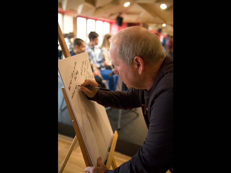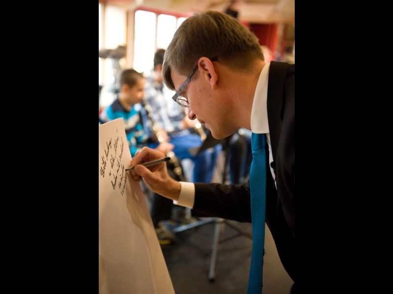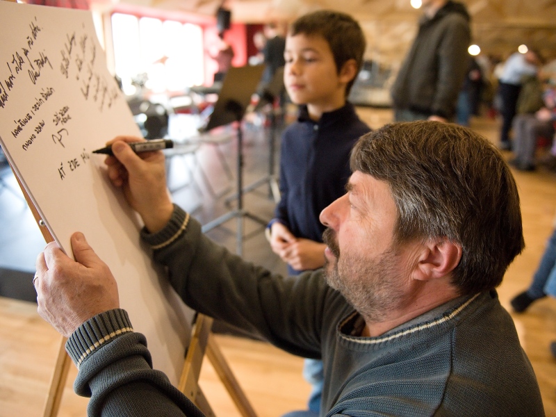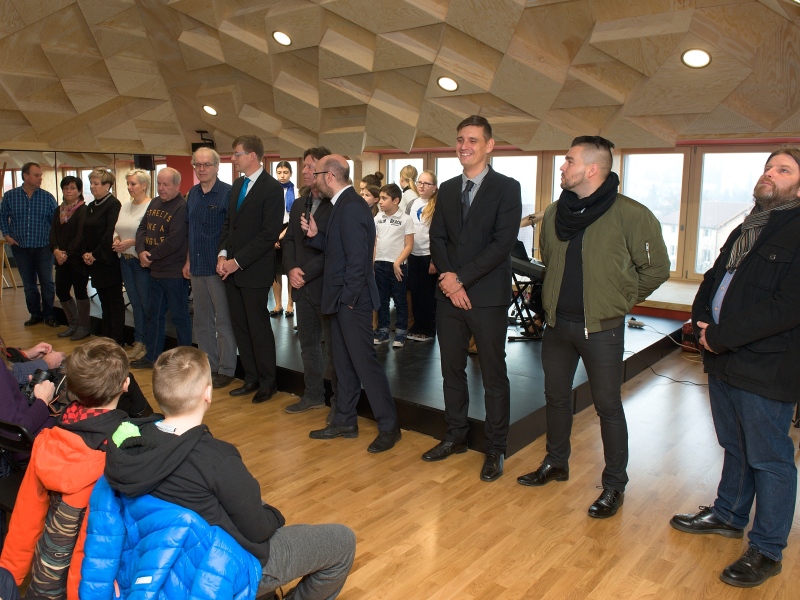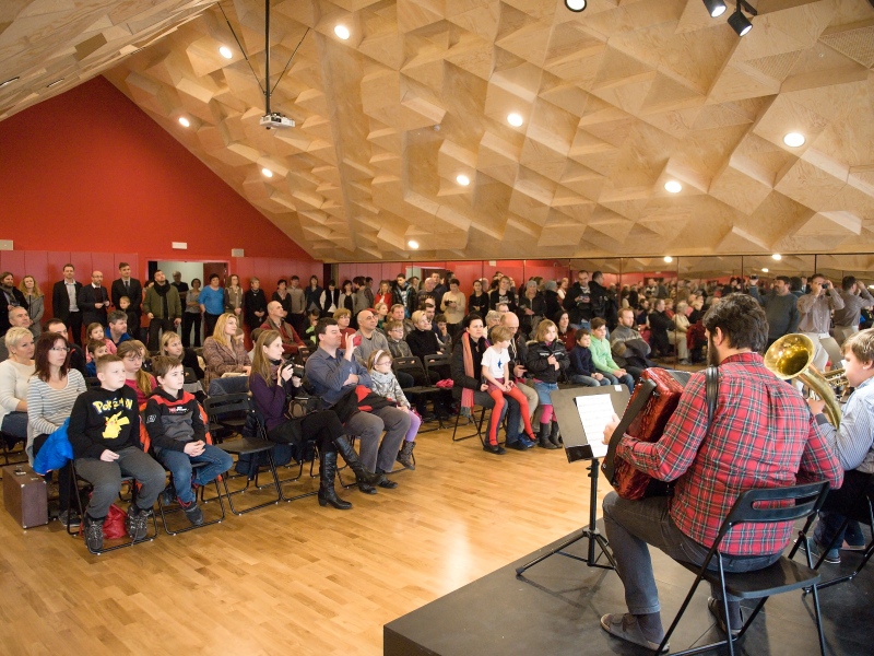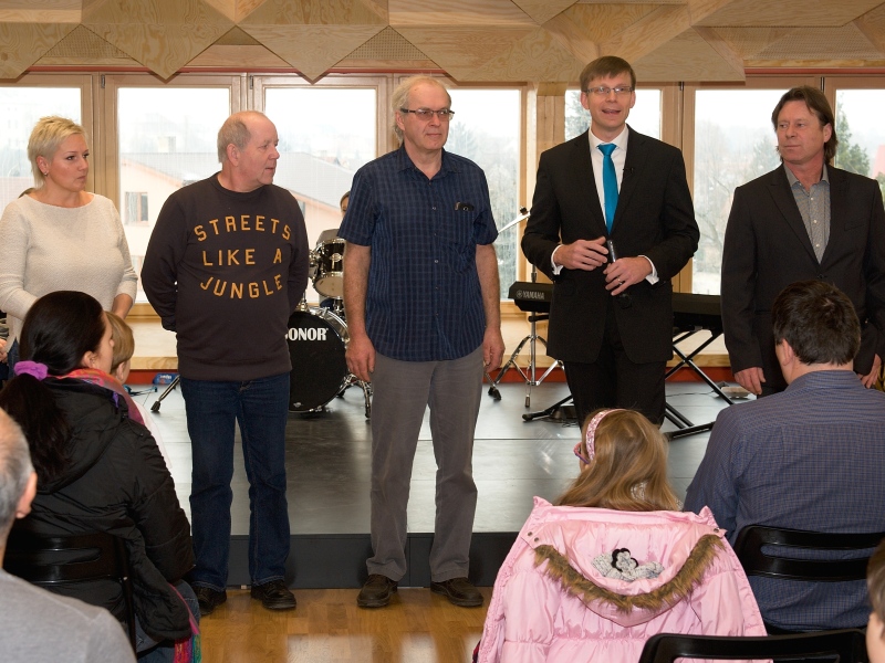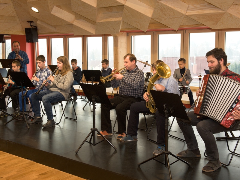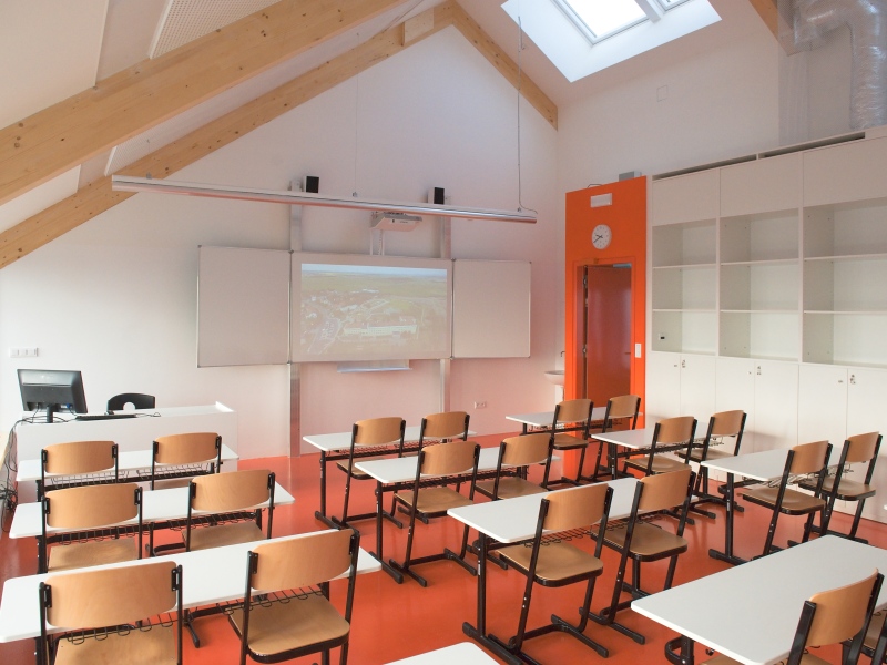 I v tomto případě vsadilo vedení obce na návrh řešení od architekta. Stavbě předcházela samozřejmě i diskuse s pedagogy o tom, jak by mohlo uspořádání nového prostoru vypadat. Nejvážnější omezení ale představovaly požární předpisy a normy. „Postupně jsme vyloučili hned několik variant, které přísné normy nesplnily a hledali jsme cenově dostupné řešení. Vypomoci jsme si nakonec požárním můstkem do budovy s učebnami ZUŠ. Tím se podařilo vyřešit problém únikových cest. Celé projektování se ale ze všeho nejvíc podobalo tanci mezi kapkami deště. Snažili jsme se ale především vytvořit zajímavé a pěkné prostředí pro žáky. Každá třída má svou barvu. Z každé je také krásný výhled na obec a z chodby pak na Duhovku. Všechno by se tu mělo spojit v jeden smysluplný celek. Znovu jsme využili konstrukci z lepených dřevěných vazníků. Jen díky tomu nemusí mít celý prostor vlastně žádný sloup. Velkou péči jsme věnovali koncertnímu sálu a aule. Měli jsme za úkol zajistit dobrou akustiky sálu. Vypomohli jsme si vlastně výtvarným dílem. Strop totiž tvoří kombinace různě vysokých trojúhelníkových ploch. Věřím, že i díky tomuto osobitému řešení, bude prostor pro všechny návštěvníky příjemný a lákavý,“ přibližuje celý projekt architekt Jan Hájek.