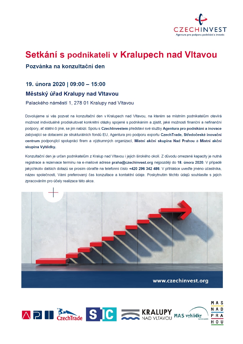19. února 2020 se od 9:00 uskuteční v Kralupech nad Vltavou konzultační den, na kterém se místním podnikatelům otevírá možnost individuálně prodiskutovat konkrétní otázky spojené s podnikáním a zjistit možnosti finanční a nefinanční pomoci. Více informací v přiložené pozvánce.