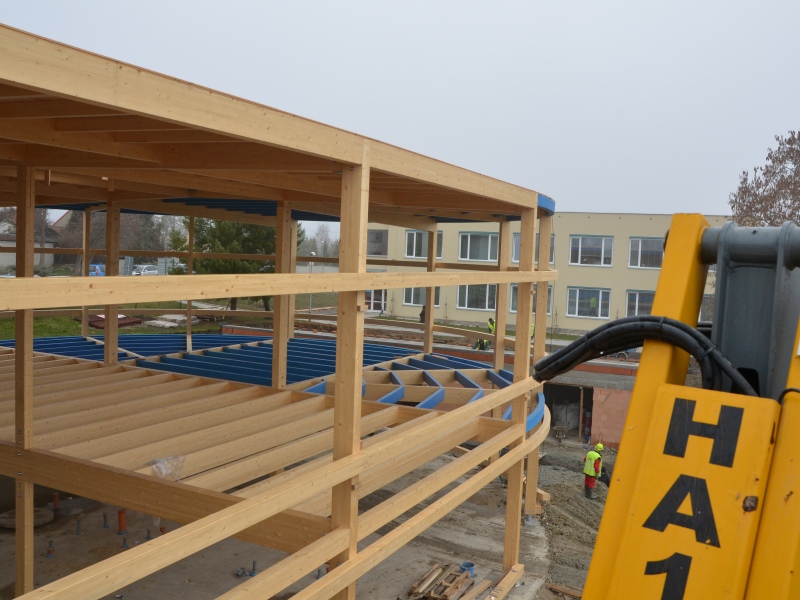 Stavba nové tělocvičny vstoupila do další fáze. Začínají práce na střeše a na obvodovém plášti.
