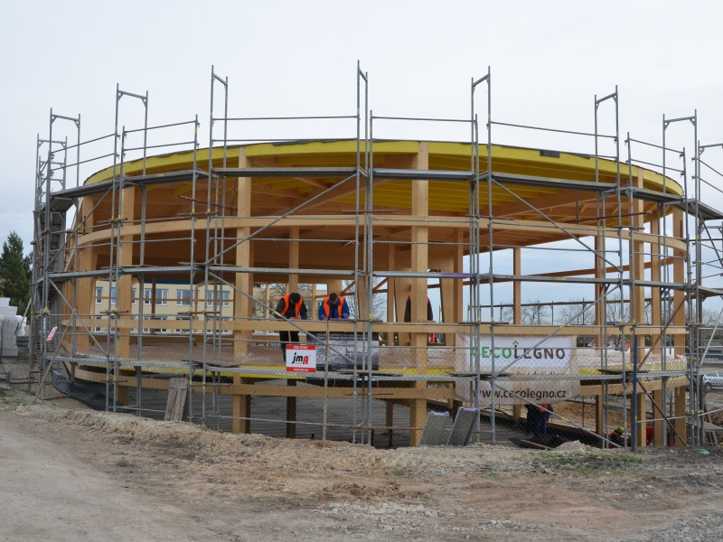 Ve velmi dobré kvalitě zvládla stavební firma a její subdodavatel společnost Cecolegno montáž celé nosné konstrukce a záklop střechy a stopů prvního nadzemního podlaží. Lepené dřevěné segmenty vyrobily z českých smrků továrny v Rakousku a Německu. Čeští montéři je smontovali nejen velmi přesně, ale zároveň v plánovaném čase.