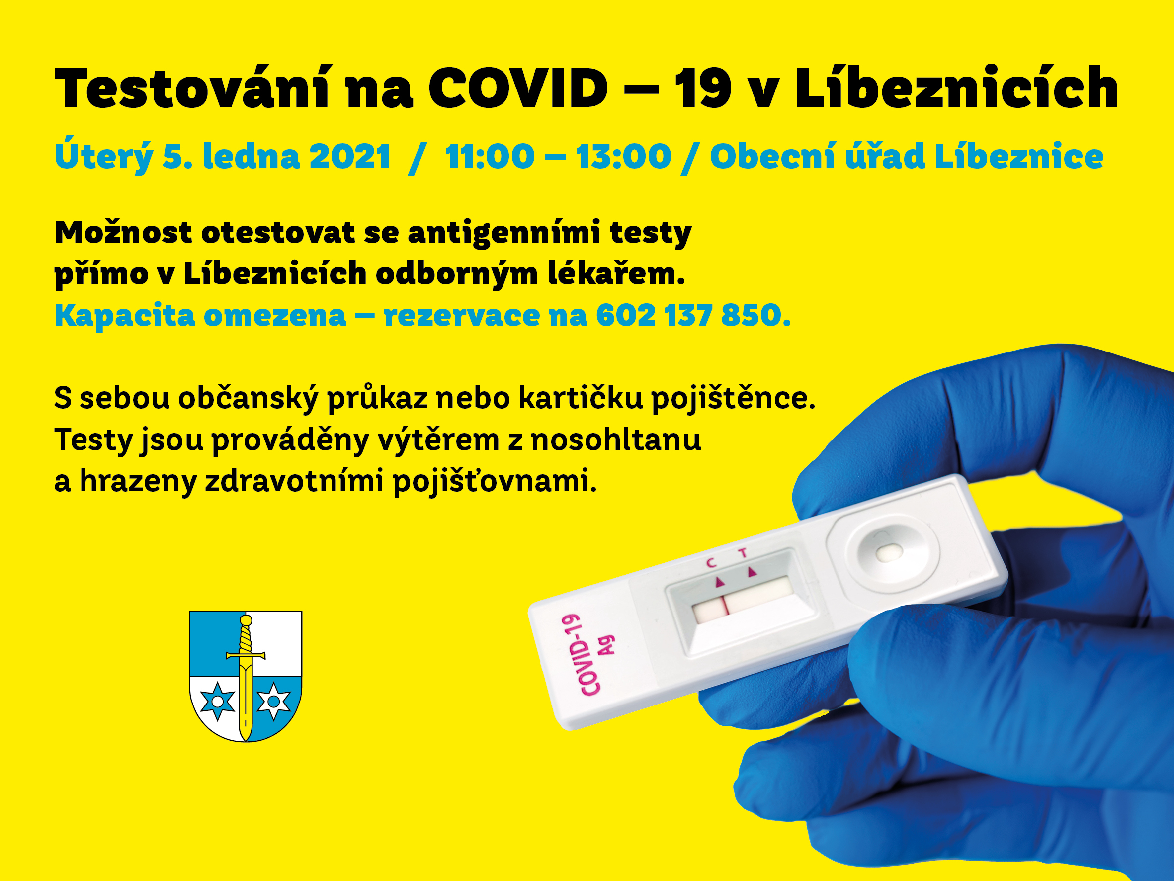 Nabízíme další termín testování na COVID - 19 v Líbeznicích. Otestovat se antigenními testy je možné v úterý 5. ledna 2021 od 11:00 do 13:00 opět na obecním úřadu. Kapacita je omezena, rezervace termínu telefonicky na 602 137 850 dnes 30. 12. do 17:00 nebo zítra 31. 12. do 12:00.