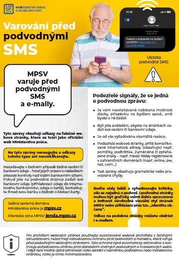 Ministerstvo práce a sociálních věcí (MPSV) varuje před podvodnými sms a e-maily, které obsahují odkazy na falešné webové stránky, které se tváří jako oficiální web MPSV. Na tyto zprávy nereagujte a odkazy nerozklikávejte.