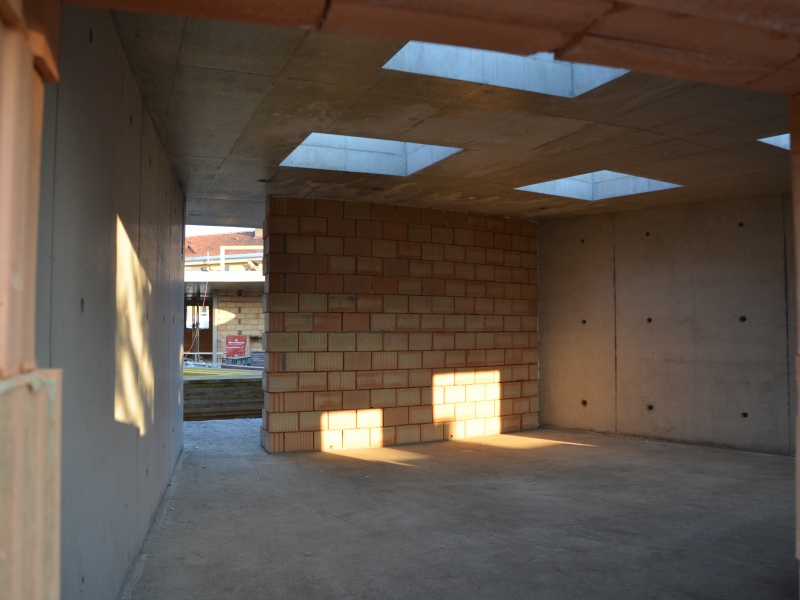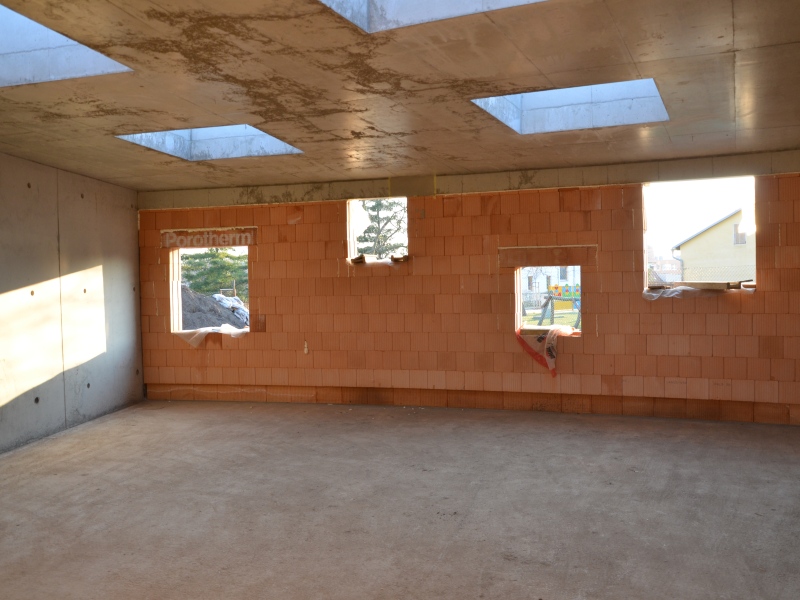 V pondělí 23. března se podařilo vybetonovat poslední střešní světlík. Společnost Hobst, která realizovala všechny prvky z pohledového betonu, tak dokončila svoje dílo. "Jsem velmi spokojen s kvalitou práce. I na pracovnících na stavbě bylo vidět, že jim na výsledku záleží," hodnotí náročnou část stavby starosta obce Martin Kupka.