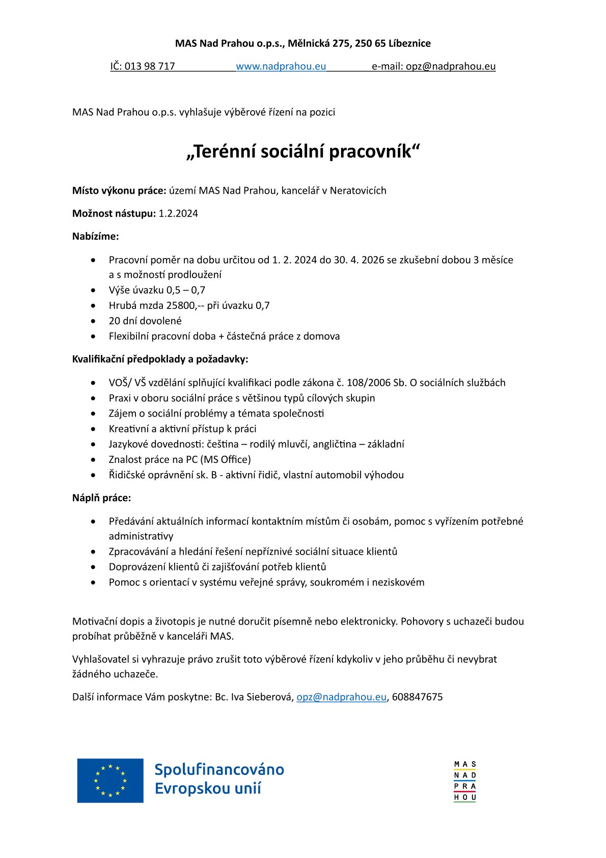 MAS Nad Prahou vyhlašuje výběrové řízení na pozici terénní sociální pracovník. Bližší podrobnosti naleznete v přiloženém souboru.