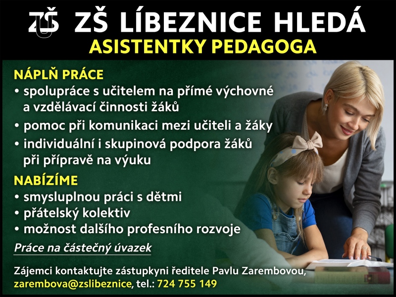 15.3.2024 ZŠ Líbeznice hledá asistentky pedagoga na dvě volné pozice na částečný úvazek. Více v přiloženém souboru. Přiložené soubory zs_inzerce_2480x1860_8_2022_asistentka_002.jpg (1.07 MB)