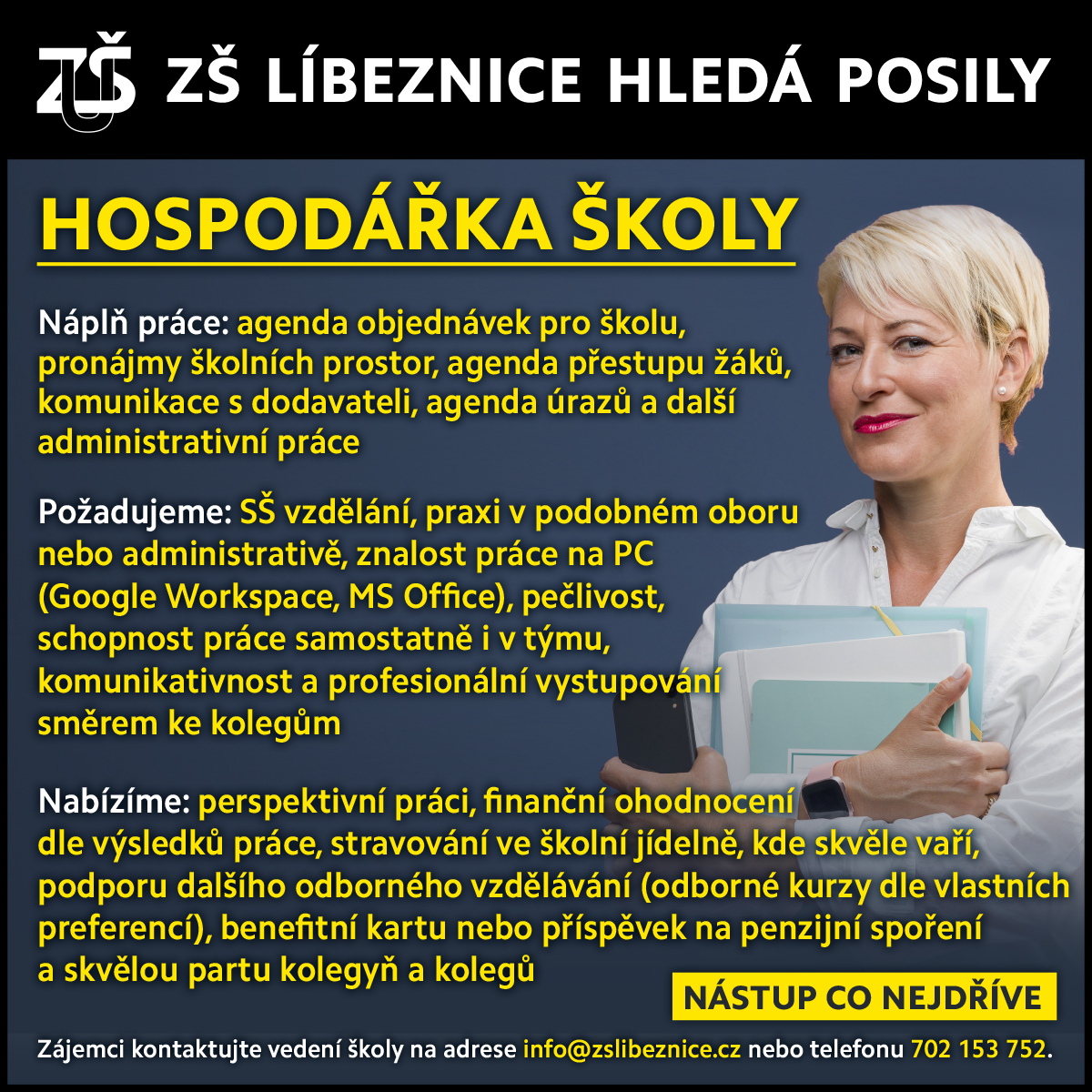 ZŠ Líbeznice hledá do svého týmu hospodářku školy. Podrobnosti naleznete v přiloženém souboru.Nástup možný ihned.
